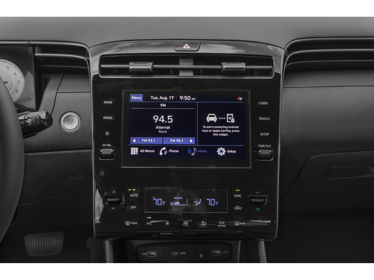 - Radio: AM/FM Audio System -inc: low-cost display audio, 8" color touchscreen, 6 speakers, SiriusXM satellite radio w/3-month trial subscription, HD Radio, Blue Link connected car system, Bluetooth®, wireless Apple CarPlay and Android Auto and dual front high-power USB outlets